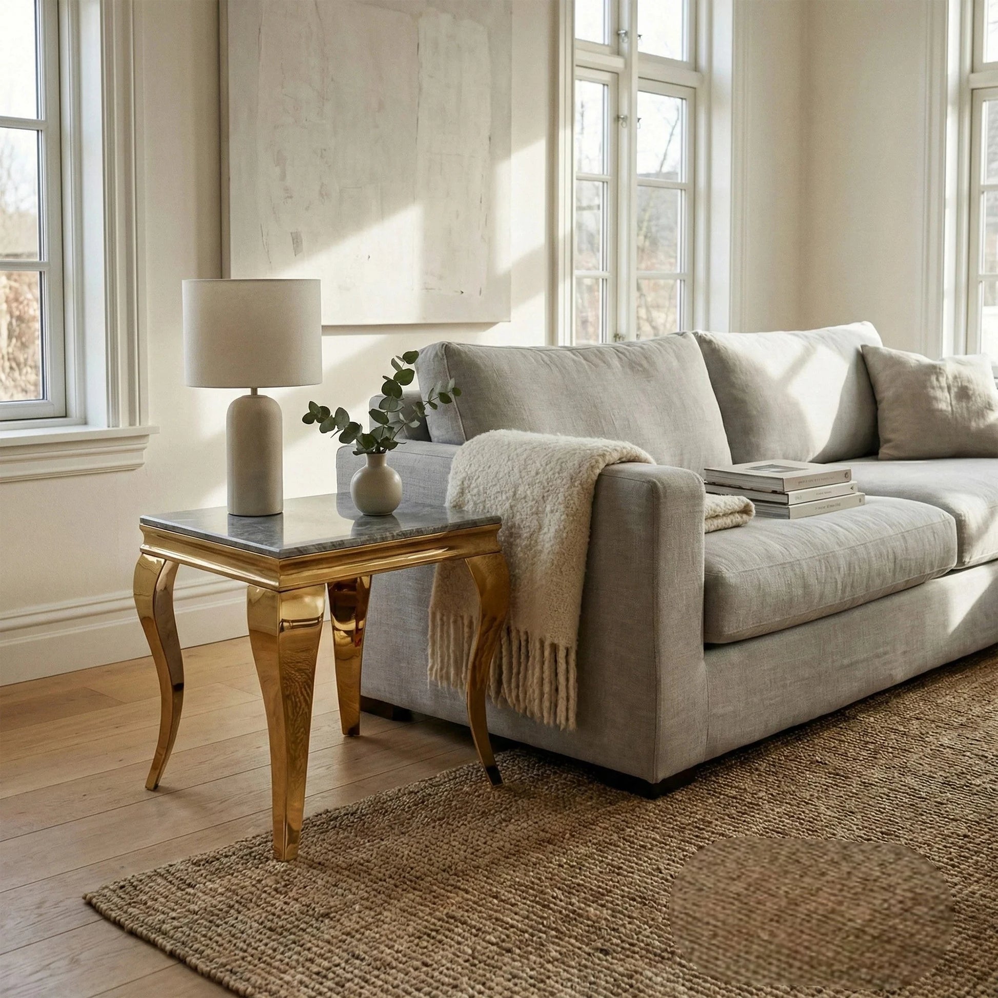 The Lorens 60cm Gold Lamp Table showcases a luxurious square silhouette with elegant curved gold legs and your choice of Black & Gold Marble, Cream Marble, Light Grey Marble or Polar White Sintered Stone. A perfect companion for sofas, lounge seating or as a modern bedside table.