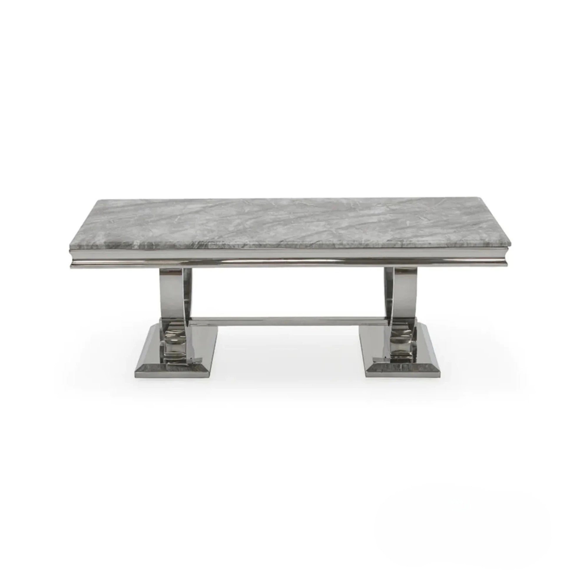 Transform your living space with the Orvar 130cm Chrome Coffee Table, featuring a sophisticated rectangular silhouette and an elegant white marble effect top. Its polished double half-ring (U-stand) pedestal base delivers both stability and contemporary style.