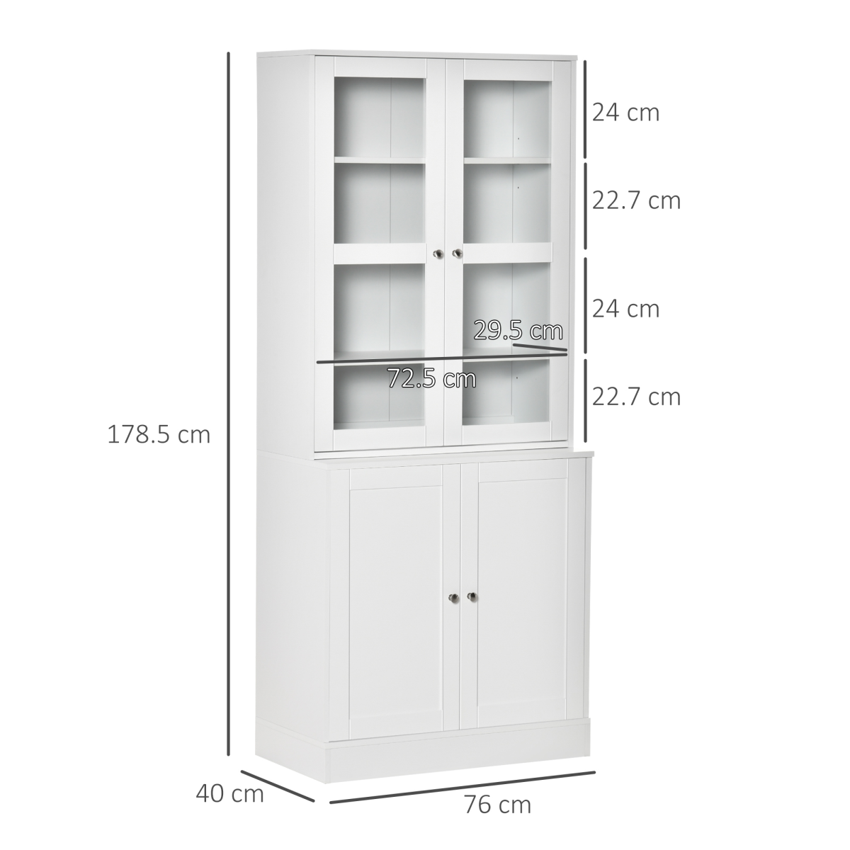 DOUBLE STORAGE: Formed of upper cabinet and bottom cupboard, a beautifully mixed way to store and display your items. Great for dining, lounge, kitchen and other home spaces.TWO ADJUSTABLE SHELVES: Upper cabinet tiers move up and down, so you can adjust to a position which suits you.GLASS DOORS: Tempered finish for extra strength and safety. Allows you to see inside the top half to display items beautifully. Handles on all doors to open and close easily.DIMENSIONS: 178.5H x 76W x 40Dcm.MAXIMUM LOAD: Whole: 30kg. Shelf: 5kg. ASSEMBLY REQUIRED.